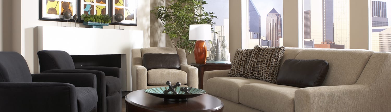 Sofa, Chair, Coffee Table, End Table & Lamp, Smart TV, TV Stand, Rug, Wall Art